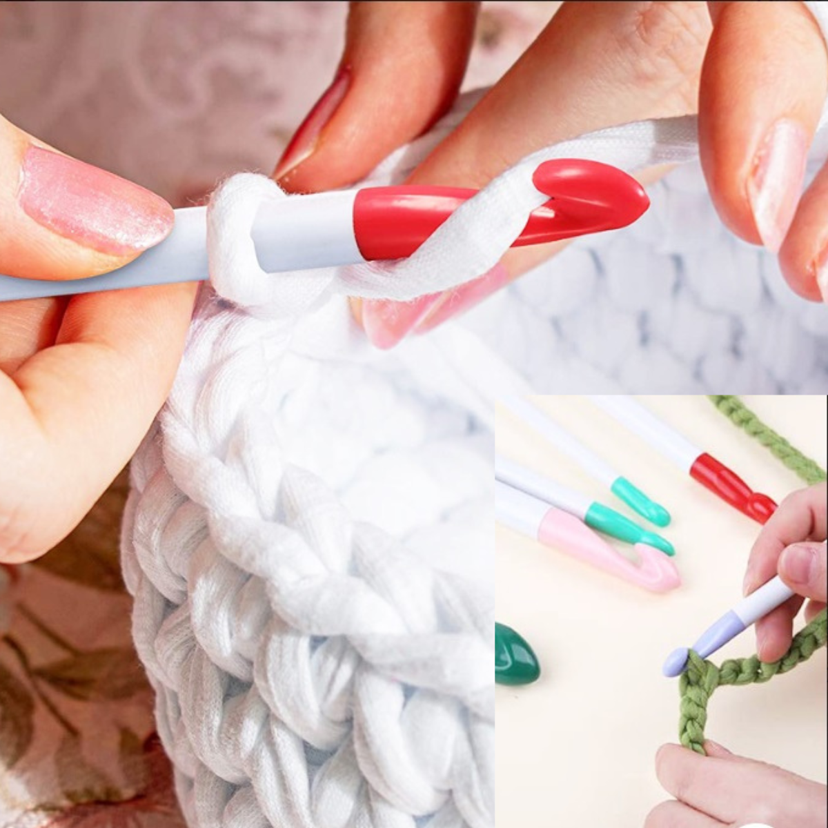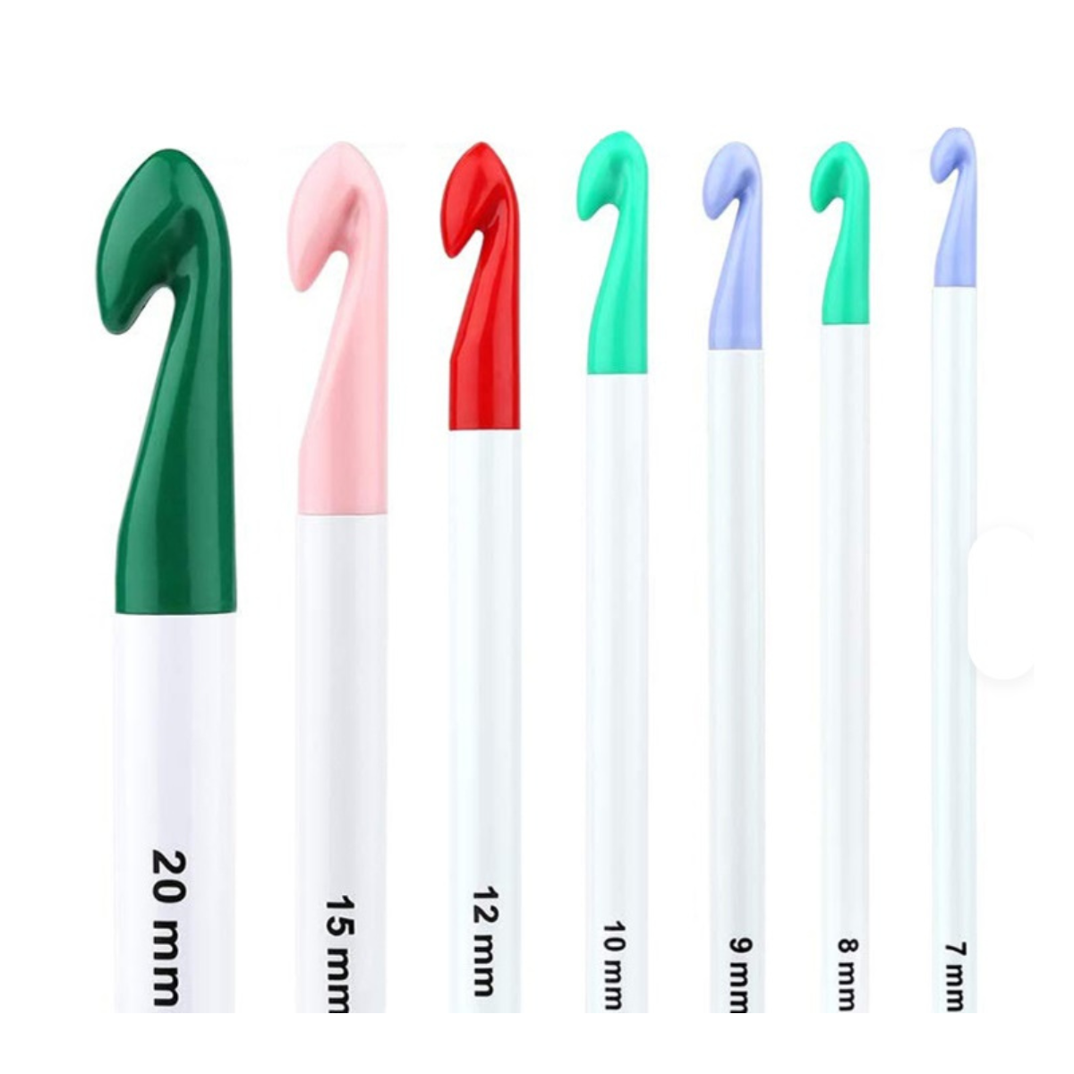 Set de 7 agujas de crochet de gran tamaño, diseñadas especialmente para tejer con hilados gruesos como trapillo, macramé o lanas voluminosas. Están fabricadas en plástico hueco, lo que las hace livianas pero firmes, perfectas para trabajar sin esfuerzo por muchas horas.