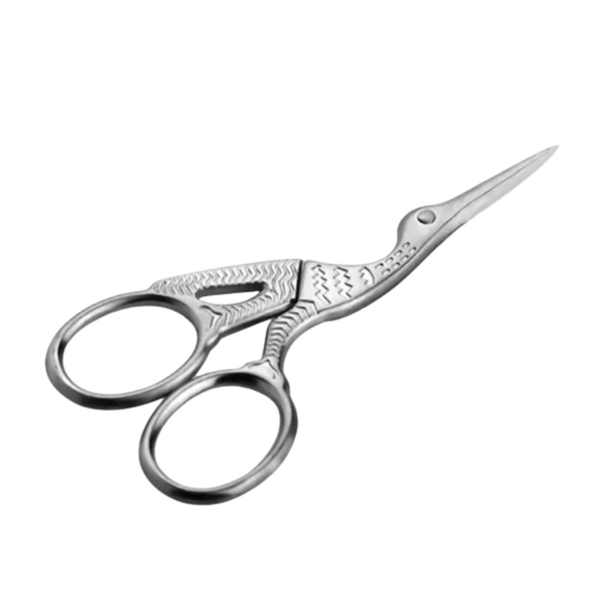 Tijera de costura y bordado con diseño vintage de cigüeña, ideal para trabajos de precisión. Fabricada en acero inoxidable, su filo permite cortes limpios en hilos y telas delicadas. Su tamaño compacto de 9 cm de largo y 4 cm de ancho la hace perfecta para llevar en cualquier kit de costura.