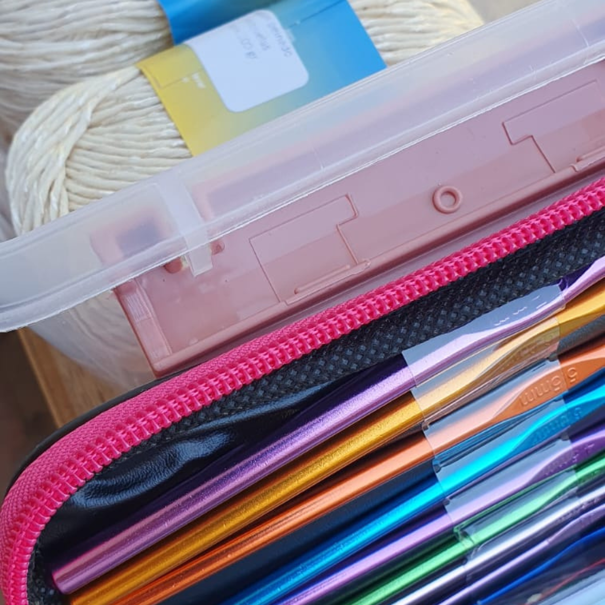 🎒 1 cartuchera organizadora con 100 piezas: agujas de crochet en aluminio, marcadores, tijera y más accesorios.